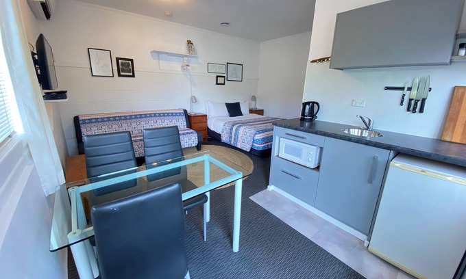 Located in the heart of central Paihia with the Paihia Wharf only a 5 minute walk away. With a bakery, supermarket, cafe's, restaurants and shops within a few minutes, there is hardly a need for a car but off-street parking for 1 car is available if required. The Studio is openplan with your own bathroom, and a kitchenette equipped with microwave, fridge, kettle, toaster (no hob or oven) allowing for basic meal prep. Ideal for a single / couple with a Queen-bed and a king-single sofa-bed (bedding on request only) in the living area.