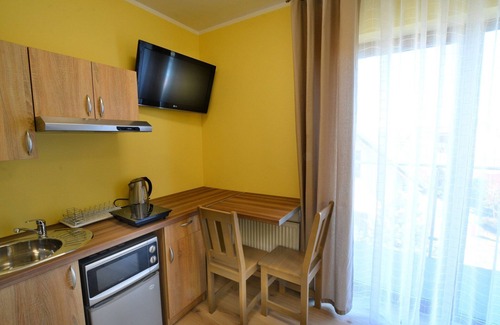 Layout: On the 1st floor: (open kitchen(electric kettle, cooker(induction), microwave, fridge-freezer), Living/bed room(double sofa bed, TV(flatscreen, german television channels), dining table, balcony), bathroom(shower, washbasin, toilet)) Reception, Play area, Lawn, heating(central), garden(shared with other guests, fenced, 1800 m2), BBQ(charcoal), parking, trampoline(shared with other guests), sand pit(shared with other guests), play equipment(shared with other guests), slide(shared with other guests), table tennis table(shared with other guests), Garden shed, Swing set, baby crib(free)