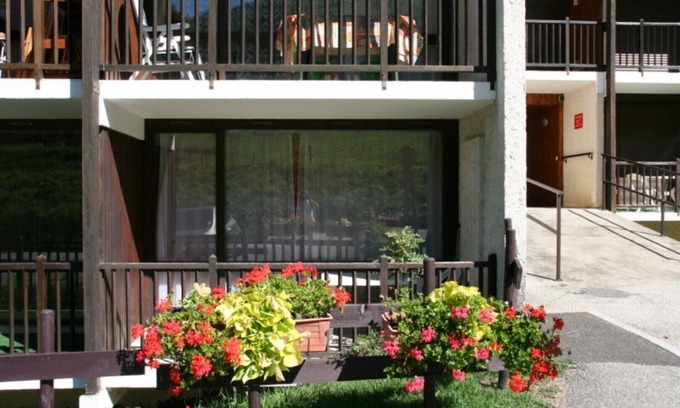 Nice renovated studio on the ground floor with large bay window and south facing balcony facing the slopes in Savoyard residence