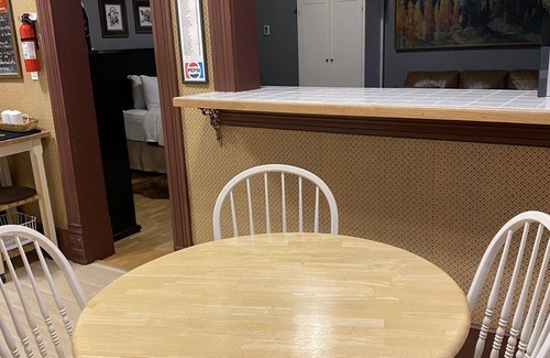 The kitchen is equipped with a small apartment stove and oven, apartment size refrigerator, microwave, and dinette table with four chairs. The bathroom has a pedestal sink, toilet, and a shower. The rooms are bright with large, south facing windows with a view of 13th Street and Sultan Mountain. Everything in town is within walking distance to include restaurants, shops, train, historic buildings, and the museum.