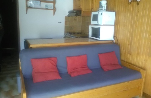 South exposure, view of the 40m² duplex slopes side in a quiet building with a covered entrance, consisting of an entrance hall with dressing room and storage, kitchen room: Table and chairs, fridge, oven, hob, microwave, meat grill ( croque-monsieur), vacuum cleaner. Living room with sofa bed (2 pers), flat screen TV, DVD player, playstation, board games, bathroom / wc (bathtub) hairdryer, balcony, garden table and chairs, Mezzanine (1 double bed + 1 bed simple), storage spaces.