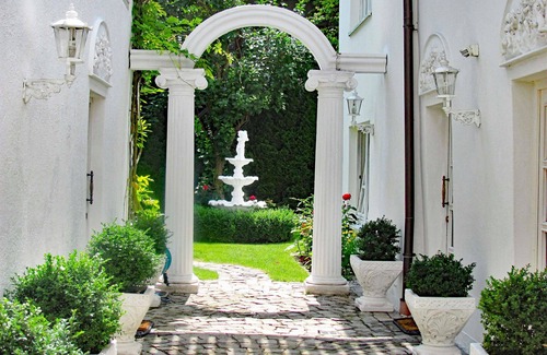 A romantic garden and courtyard with seating and a table is available to all guests.