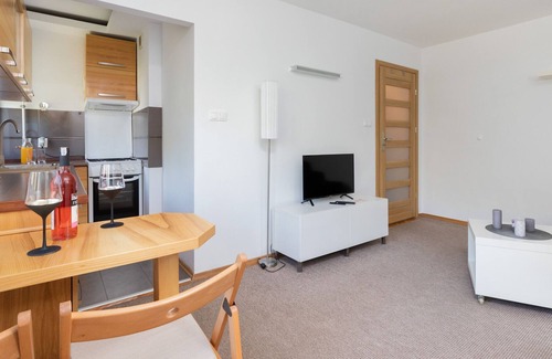 The bright 25 m² apartment has the ability to accommodate 2 people. The space of the property offers a living area, a comprehensively equipped kitchenette and a bathroom with a shower and toilet. The windows overlook the courtyard and the neighboring block. The living area, equipped with a comfortable corner sofa, is a perfect place for rest and relaxation. The apartment has a free Wifi connection and Internet TV. The functional layout of the rooms and comprehensive equipment with necessary kitchen and bathroom accessories guarantee a comfortable stay. Guests can take advantage of a welcome set of toiletries (soap, shampoo and shower gel), towels, bed linen and a wide range of household goods.