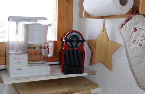 Kitchen with mini oven, microwave, Nespresso, coffee maker, refrigerator, 2 ceramic hob, raclette.