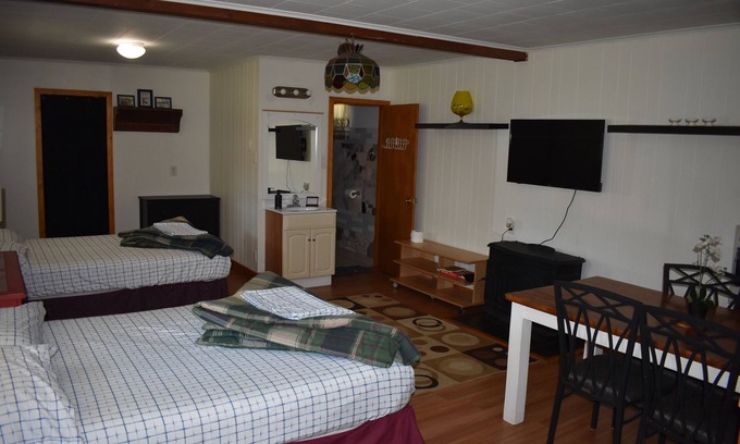 We offer four different rooms for rent within a motel-like structure. This particular room, with two queen beds, a kitchen and a bathroom, accommodates up to four people. Guests will have access to Wi-Fi and television (Netflix), along with typical essentials and amenities. Outside, there are grills, picnic tables and a spot for campfires. It is just a few minute walk to both lakes, the beach and a boat rental location that offers kayaks, electric rowboats, canoes and pedal boats. Bike rentals will also be available, as there are many different roads and trails to explore around the area. An ideal place for experiencing a peaceful vacation with similar adventures to camping, but all at the comfort of utilizing a kitchen and spending the night in a cozy bed.