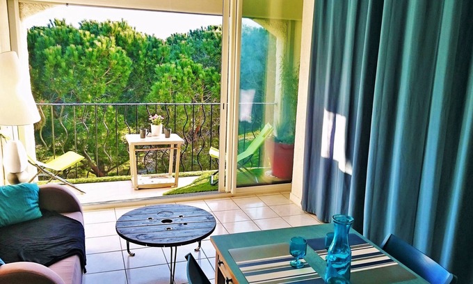 The 25m² studio is bright. The loggia offers a soothing sensation with its view of a green pine forest, calm and no vis-à-vis.