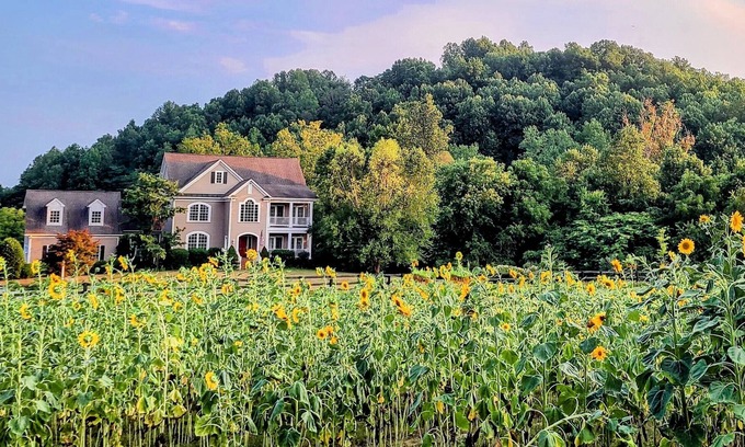 Enjoy a getaway with views in the scenic Blueridge mountains with a stay at the Sunflower Suite at Four Goodness Flower Farm. This 1 bedroom, 1 bath studio with a private entrance, detached from the main home, is located on a five acre farmette with mountain views. The upstairs space has a queen bed, a sleeper sofa and the option for full air mattress. It includes a kitchenette with Keurig, microwave and fridge. Take advantage of the outdoor space with a sunset stroll through the sunflowers in summer and end the evening around the gas fire pit. The property is in a prime location for great hiking, wine tasting and brewery hopping; located right on the Nelson 151 Brew Ridge trail and just 5 minutes from the entrance to the Blue Ridge Parkway and Shenandoah National Park. There are 9 wineries within 5 miles and 11 breweries/cideries/distilleries within 10 miles. The Blue Ridge Tunnel hike is a five minute drive. There are kayaking, paddle boarding and rafting opportunities nearby. Prime trout fishing locations within a short drive. Wintergreen Resort, located just half an hour away, has year round recreational activities including skiing and hiking. The historical city of Charlottesville, the University of Virginia and the Monticello is 18 miles away.