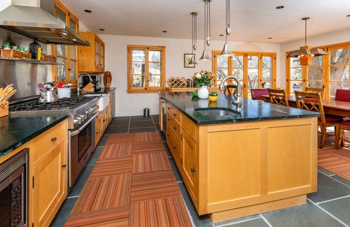 Treat yourself to a stay at Clayridge Farm, a beautifully restored historic farmhouse situated on 13 pastoral acres with a pond, stream, fields and gardens. This stunning 3 bedroom, 2 bath home features wide planked floors, exposed beams, vaulted ceilings and a gorgeous modern addition. Downstairs, a majestic two-story living room has a large stone fireplace, and the spectacular chef's kitchen features stainless steel appliances, soap stone counters and a dining area surrounded by glass doors that open onto a large deck and outdoor dining area. There is also a cozy den with a widescreen TV, a side porch with washing machine and dryer, and a large, tiled entranceway. Upstairs is the stunning main suite with vaulted ceilings, floor-to-ceiling windows and a sumptuous bathroom with a double stone shower overlooking the pond and gardens. There is an ample second bedroom with a desk and full bathroom. On the third floor, there is a charming attic bedroom with a large desk. The property is a short drive to shops and restaurants, hiking in Nockamixon State Park, swimming, hiking and tubing along the Delaware River and restaurants and shops just 10 minutes away in charming Frenchtown, NJ. Please note both bathrooms are upstairs, and the house is not suitable for children under 12.