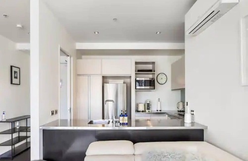 The main room of the apartment has a fully functional kitchen with oven, microwave, and dish washer. The living area has a sofa, a smart TV, and a dining table with four chairs. There is also a beautiful balcony with stunning views across Viaduct Harbour - great for a cup of coffee in the morning or a glass of wine at night!