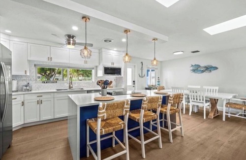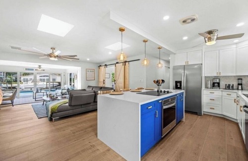 3 bedrooms, 2 baths that comfortably accommodates up to 8 people. The sunshine coming through both skylights accentuates the elegant and cozy open concept floor plan. Perfect for family reunions, vacations, and celebrations, spend your time as a real Floridian! If you prefer to stay on land, this house has a large backyard with amazing water view, pool with jacuzzi, BBQ/Bar with TV.