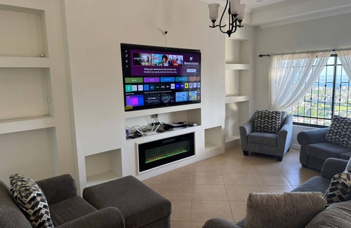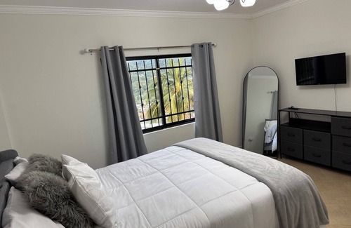 This 4-bedroom, 3bath villa in Port of Spain is perfect for your escape to the vibrant city. Space for everyone with 5 beds- 1 king bed, 2 queen beds, and 2 full beds, this pleasant retreat offers a delightful stay for guests. Enjoy the convenience of amenities like full kitchen , wrap around porch, entertainment area, play area, complementary parking, AC, WiFi, and washer and dryer. The 3 bathrooms are equipped with showers and hair dryers for your comfort. We hope you enjoy what our place and Port of Spain has to offer.
