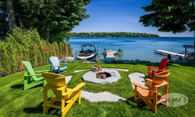 FOUR SEASONS LAKEHOUSE - This recently renovated and updated waterfront spot is the perfect Lake Simcoe family getaway. The open concept living space with it's welcoming and cozy decor is perfect for summer and winter family getaways. The main floor kitchen and dining area offer views of the lake and easy access to a large covered deck that boasts a gourmet, chef-inspired built in BBQ and ample seating. The outdoor space at this property is as well laid out as the inside. The large driveway allows for multiple cars and still has ample room to get the kid's bikes out. Four Seasons is conveniently located in the centre of Orillia but on a quiet tree lined street with little traffic. The waterfront offers a fire pit and lots of room for yard games as you meander over to the lake front. At the waterside is a rocky, shallow gradual entry until the end of the dock. The large dock is perfect for your boat or rental and the quiet protected bay allows for easy maneuvering.