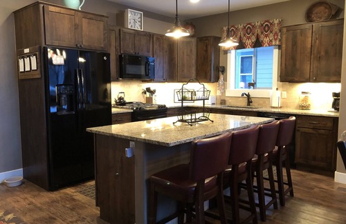 Our barn red cabin welcomes you with an inviting front porch with beautiful teak rocking chairs to sip your drink and take in the glorious sunsets. This large newer home has 3 spacious levels plus a one car garage.The main level has a half bath as you enter, large fully equipped kitchen with island seating for 4, granite counter tops, lots of knotty alder cabinets and a 5 burner gas stove. Dining room opens up to huge vaulted great room with gas fireplace, floor to ceiling windows for unobstructed views of The Continental Divide. We made the deck extra big which runs the entire width of home with comfy seating and a natural gas barbecue grill. There is also a laundry room with plenty of hooks for coats. The master bedroom finishes off this level with a king bed with fully upholstered head board, walk in closet, cable/smart t.v. and private bath with travertine shower.