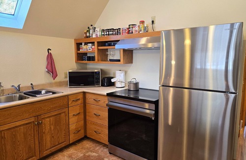 • Brand-new appliances (2024), including a refrigerator/freezer, full-sized induction range, microwave, toaster.