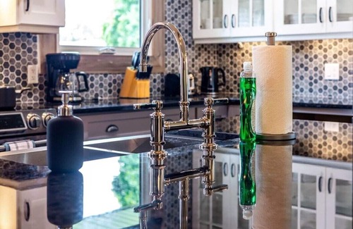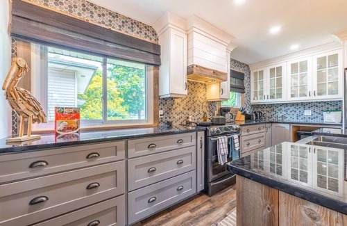 The main level of our home has a spacious and beautifully decorated living room. The main living room, dining area, and kitchen have an open concept layout. Our kitchen has a beautiful island and is equipped with stainless steel appliances. The kitchen has everything you'll need for preparing and cooking meals during your stay.