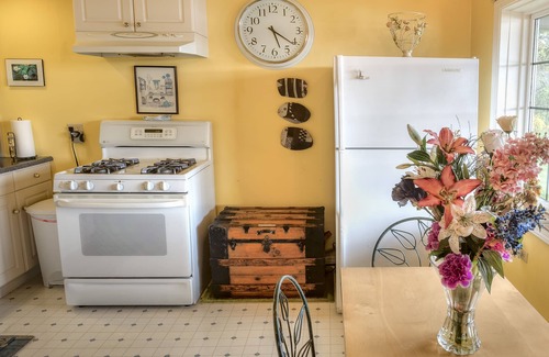 During our remodel, the wood stove on living room photo and some siding has been removed to be re-installed with the rest of all siding repairs at the end of our remodel. We already have brand new windows/entry door and metal roof. The stairs to the beach and a few other things are on the list for future improvements, so please don't expect everything to be in brand new shape, but more like a charming country cottage suite on Bainbridge Island with imperfections!