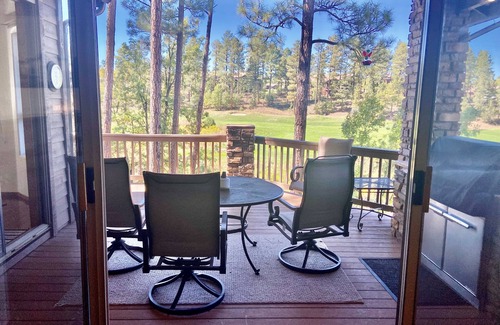 This spacious cabin in Show Low, Arizona, offers a perfect getaway with stunning views and four seasons of outdoor enjoyment. Located at a 6,500-foot elevation, it stays cooler than the Valley by about 20 degrees. The cabin sits on the 18th fairway of Torreon Country Club, overlooking two ponds, and features nearly 4,000 square feet of living space with 4 bedrooms, an office, and 3 1/2 bathrooms. Both primary bedrooms include jetted tubs and walk-in showers.