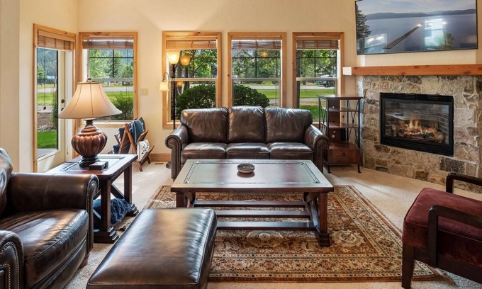 Natural light streams in through the many windows, making the natural beauty of North Idaho easily experienced from any room in the house. The Pend Oreille River can be easily viewed from the living and dining areas, as well as the front patio, where you're sure to see Bald Eagles and osprey fishing throughout the day. The chef in your group will enjoy the thoughtfully appointed kitchen, as well as the gas BBQ on the covered patio that is available year-round. For those in your group that need to get some work done, and others wanting to stream their favorite shows or movies, there's plenty of internet to go around with the super fast, Gigabit fiber internet service available via WiFi throughout the entire condo. Everyone will appreciate the direct access right from the patio to the paved walking trail that weaves its way for 9 miles throughout the neighborhood. When it's time to take a break, kick back and relax in comfort during those hot summer days thanks to the central air conditioning. In winter, turn on the gas fireplace and some music while you curl up with a favorite book - keep an eye out for frequent moose sightings.