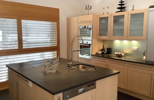 Accommodation in the chalet consists of 5 bedrooms (2 doubles, 3 twins) sleeping up to 10 people, each with en-suite shower rooms. All bedrooms have south facing balconies with stunning views. The chalet provides bright, spacious, contemporary living accommodation with real wood flooring, underfloor heating and large glass frontage windows, which maximise the stunning views of the Valaisan Alps. The living areas include relaxing leather sofas, a log burning fire, Flat screen TV, and free WiFi access throughout the chalet. The kitchen has a marble topped island unit, double eye level ovens with integrated microwave and grill, tall fridge freezer and a Bosch dishwasher. Situated directly off the kitchen area there is an open plan dining area. The layout is perfect for sociable cooking and entertaining. Parking is available at the chalet door, with a convenient car port at the entrance.