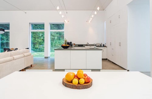 Designed by Warren Freyer of Freyer Collaborative, the house was sited towards the hill's peak to benefit from great light and cool breezes and, most importantly, provide an immersive experience with the birds and nature. Eagles are regular visitors! Located on 100 acres, guests can experience the ultimate Catskill living, with woods, a private waterfall, and stunning rugged terrain, before coming inside to enjoy many luxury features.