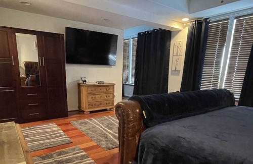 - Master Bedroom with Master bath: King bed with adjustable base, 55’ TV (with app access (Netflix, etc)), dressers, custom closet (some cabinets will be locked for owners closet), sink, steam shower with multiple shower heads/rainfall shower (sheets and towels provided)