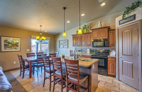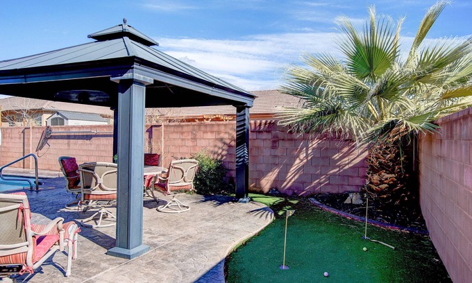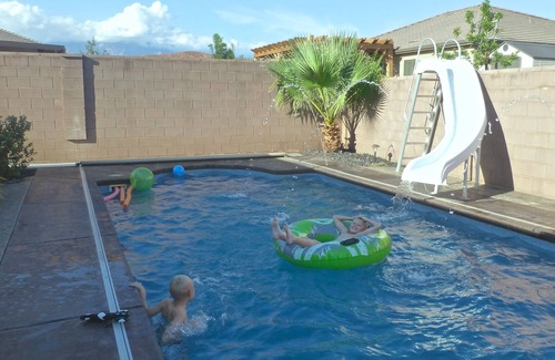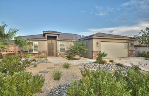 This kid friendly home has 2 sets of bunk beds, 2 brand new Birch hybrid organic hypoallergenic king beds, and 1 queen bed. The 40 foot pool has a great water slide, creating lots of fun for the "kiddos",both young and old! Cook up some hamburgers and hot dogs out on the patio and relax under the Gazebo. Putting green for the golf enthusiasts in the family. After a fun filled day, sit down and relax with 4 flat screen TV's through out the house with Dish Network and 'The Hopper' and Blue Ray DVD. or play cards or family games. Outlet mall near by, Zion National Park and Snow Canyon Park for hiking and canyoneering, Sand Hollow and Quail Reservoirs for beach and boating and all other water sports. Sand dunes for ATV adventures. Tuachan amphitheater features Broadway shows outside under the stars. World class golf all over St George and even a Costco within one mile!!! Small extra charge for pool heat in the winter months ask owner for more details.