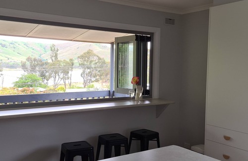A fantastic functional open plan kitchen family eating area upstairs, with stunning views of Lake Eildon.