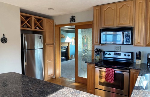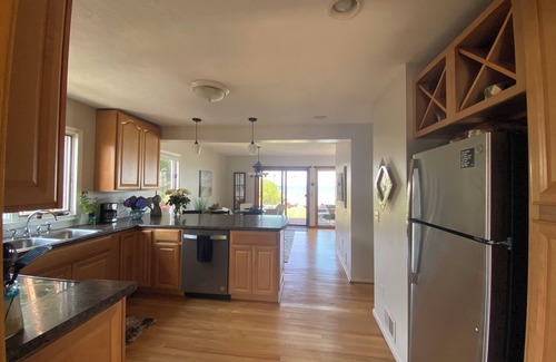Enter the mud room and through the new kitchen you'll see a wall of windows that prominently feature the lake. When frozen, it looks like you can walk to Canada. You cannot. During the summer months it looks like you can swim across. You cannot as it's 32 miles across and sometimes when the moon is full, the night is clear you might see the reflection of Canadian shoreline lights on the water. When a storm rolls in it’s absolutely beautiful watching the rolling waves and lightening on the horizon!