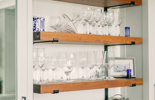 The completely renovated kitchen features high-end appliances, lots of natural light, a gorgeous wooden bar and chopping block countertop, and 6 barstools, creating plenty of room for guests to gather. The expansive, open-flow kitchen connects to the dining room and the Great Room, which boasts spectacular views of the Black Banks River and marsh. The dining room features a gorgeous, marble table with cozy chairs. The highlight of the Great Room is the RH Cloud sectional, perfect for movie nights and relaxing after a long day at the beach. The original brick, two-story masonry fireplace provides an elegant and cozy touch to the living space.