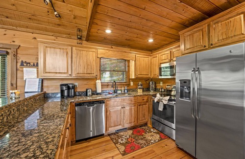 Walk out of the French doors from the third story bedroom and onto the private third-level deck to relax in the hanging chair and have a glass of wine while you admire the sunset. Guests in the main-floor bedroom can do the same and walk out of French doors to the main level deck and hanging chair! Gather around the wood-burning fireplace in the living room while you take in the mountain views through the two story windows. Venture downstairs to the game room and fix yourself a drink at the bar before playing a game of pool, foosball, darts, over a dozen board games (some for kids, some for family, and some for adults), puzzles, or Nintendo Wii while the game plays on the big-screen TV. Connect your phone or tablet to the Karaoke machine equipped with AutoTune and two microphones and sing your favorite songs. Head to the deck to play a game of corn-hole, Jenga, grill a dinner, or have a soak in the hot tub while you enjoy the mountain view with your friends and family. After the the sunset has completed its show, venture down the steps to the fire pit and cook s'mores around the fire.