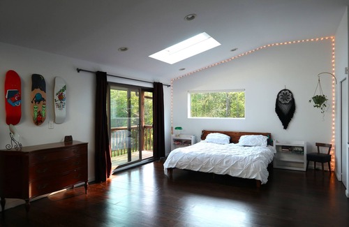 This stunning modern home and landscaped garden with a pond provides a unique, private setting located at the foot of Minnewaska State Park on a quiet, cul-de-sac road. Ideal for two couples or a family, this two story home is flooded with natural light and southern exposure streaming through floor to ceiling sliding doors and skylights. The house has two bedrooms, three full bathrooms, and an office with huge windows facing the beautiful natural scenery of the Catskills. Ideal for working from home, cooking, and relaxing. The house has been extensively renovated with glossy hardwood floors, a lofty open floor plan downstairs, and an enormous master bedroom suite with cathedral ceilings, a couch nook, a double vanity luxury bathroom, and an outdoor balcony.