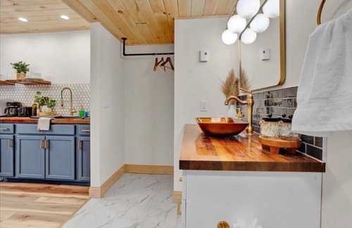 Have a relaxing stay in this charming cabin themed unit with modern amenities and tasteful décor, perfect to nestle up in on a snowy day as you watch the flakes fall gentle onto the pine trees around you.
