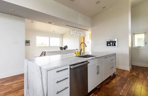 The retreat is nestled on a gentle hill vista surrounded by views of the neighborhood and downtown Austin from virtually every window. In addition to a large designer kitchen with both indoor and outdoor dining areas, this architect-designed home has 3 bedrooms, 2.5 bathrooms, and an office, sleeping comfortably up to 6 quests in two queen sized beds and one king sized bed.