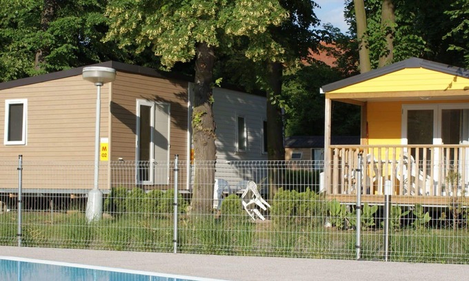 Praha/Dolní Počernice: Child friendly, cosy holiday village "Camping Sokol", surrounded by trees. On the outskirts, in a sunny position, in the countryside. For shared use: property (fenced), swimming pool (15 x 8 m, seasonal availability: 11.May. - 07.Sep.). Children's pool, children's playground. In the complex: reception, restaurant, WiFi, table tennis, trampoline, shopping facilities, bicycle rental. Parking at the house. Shop, grocery 10 m, supermarket 1 km, shopping centre 6 km, restaurant 10 m, bus stop "Škola Dolní Počernice" 200 m, railway station "Dolní Počernice" 1 km, bathing lake "Počernický rybník" 100 m. Golf course 2 km, tennis 5 km. Please note: entertainment in the season. Baby equipment (extra).