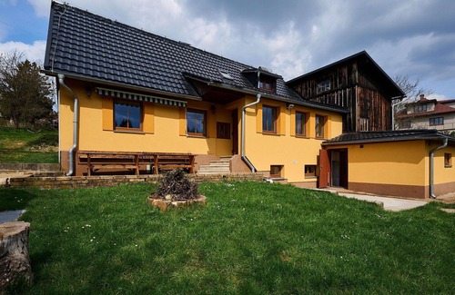 Jesenný offers a child-friendly vacation rental house "U Pekařů" located on the outskirts, in a quiet position on top of a hill, 8 km from the skiing area. The house boasts amenities such as a swimming pool (above ground, round, seasonal availability from June 1 to September 30), a slide, a terrace (20 m2), garden furniture, a fireplace, and a children's playground with a swing. It also features Wi-Fi, central heating, and parking for three cars.
