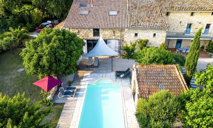 Le Mas d'Adélaïs is an old and beautiful manor house built in 1851, surrounded by meadows, fields, and vineyards in Baron, France. This renovated property features a well-kept garden of 1,200 square meters with a lawn, wildlife garden, and a swimming pool (8 x 5 meters, depth 130 - 190 cm, available seasonally from June 1 to September 30) with a shutter cover. Enjoy the terrace, garden furniture, and on-site parking for up to three cars. The property also offers internet Wi-Fi access.