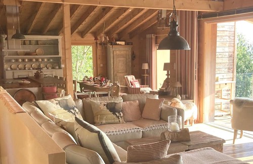 "Chalet Coin de Paradis", 5-room chalet on 2 levels, south-west facing position. Luxurious and wooden furniture furnishings: large living/dining room with open-hearth fireplace (only for decoration), TV. Exit to the terrace. Large, open kitchen (dishwasher, 4 induction hot plates, toaster, kettle, electric coffee machine, fondue Set (cheese)). Sep. WC. On the lower ground floor: 1 room with 1 french bed (140 cm, length 200 cm), hand-basin, separate WC and shower. 1 room with 2 x 2 bunk beds (90 cm, length 200 cm). Living/dining room. Exit to the terrace. 1 room with panoramic window with 2 beds (90 cm, length 200 cm), hand-basin and shower. Exit to the terrace. Open kitchen (4 hot plates, oven, kettle, electric coffee machine, Capsules for coffee machine (Nespresso)). Shower/WC, sep. WC. Large terrace. Terrace furniture. Marvellous panoramic view of the lake, the mountains, the valley, the countryside and the resort. Facilities: children's high chair, baby cot for up to 2 year olds (extra), hair dryer. Internet (WiFi). Reserved parking at 50 m. Please note: non-smokers only. Maximum 1 pet/ dog allowed.