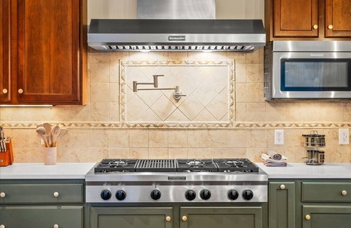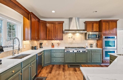 Fully stocked Kitchen with SS appliances, Quartz Countertops includes dishwasher, microwave, gas cooktop, double ovens