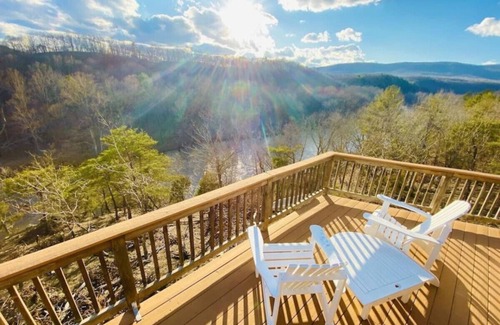 Escape to River View Cabin, a secluded mountain retreat just a 20-minute drive from historic Berkeley Springs, WV. Our 2020 renovated 4-bedroom, 2-bath cabin offers breathtaking views from a deck perched 150 feet above the Cacapon River.