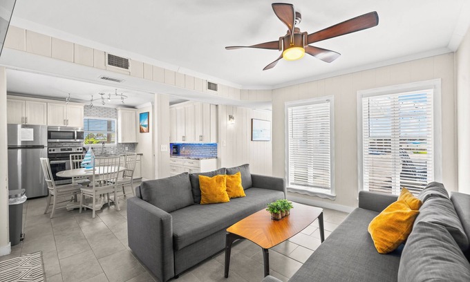 Villa 4, Come Sail Away, is a breezy two-bedroom retreat where riverfront views and beach access create the perfect balance of adventure and relaxation. The king-sized master bedroom provides a quiet retreat, while the sailboat-themed guest room adds playful coastal charm. Sunlight pours through large windows, highlighting cheerful pops of yellow and orange, and the open living area with two sleeper sofas invites laughter-filled movie nights or lazy afternoons. Cook in the sleek kitchen, share meals at the dining table for four, or gather around the fire pit under a starlit sky. Cast a line from the dock or paddleboard at sunset—this villa is all about waterfront fun. 🌴✨