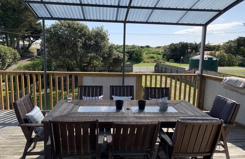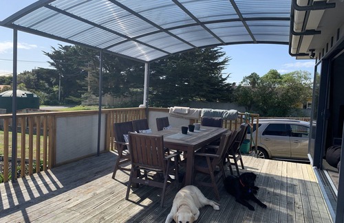 Waitarere Wonder is a renovated sunny beach house with beach access directly across the road. It has a west facing deck that is partially covered and a sheltered rear deck with an outdoor fire.