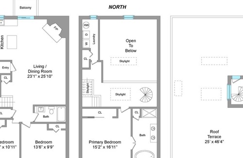 Double-height ceilings in the living room, skylights, a small balcony overlooking the rear gardens, and access to a roof deck with city views. The home is fully renovated and furnished in a contemporary style while preserving its beautiful brownstone details.
