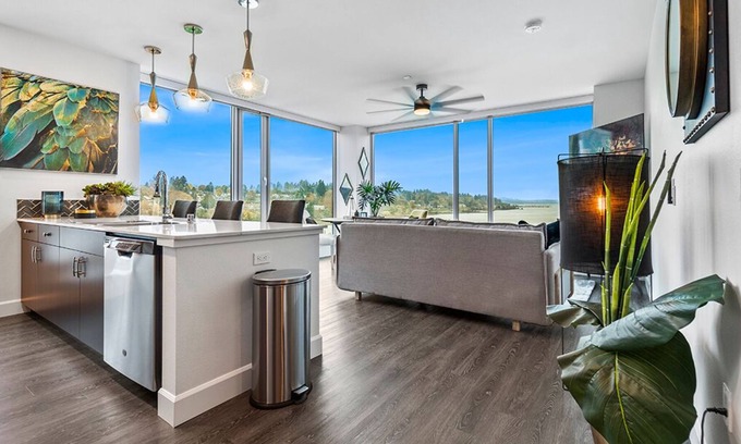 New luxury 2 bedroom suite with floor to ceiling windows which allow you to fully take in the beauty of the West Bay Marina from every room. Exquisitely decorated and fully stocked for all your essential needs. Completely secure and non smoking building. This unit is located in downtown Olympia with plenty of restaurants, bars and shopping within walking distance. Walking trails around Capital Lake, stroll along the marina or explore the Olympia Downtown Historic District.