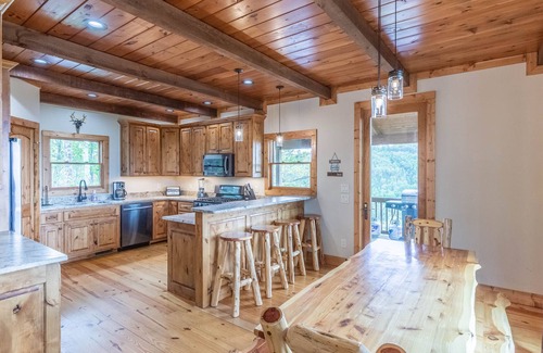 The home itself receives lots of natural light thanks to plentiful windows, many facing the mountains. The large kitchen is perfect for preparing family meals, complete with multiple seating areas. You’ll find the rustic furnishings throughout the house provide a cozy and welcoming atmosphere. The downstairs common area also features a pool table for your enjoyment.