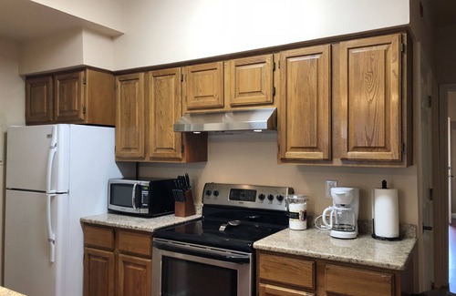 The living room is very spacious with cathedral ceiling and a flat screen TV. The kitchen is well equipped with all the pots and pans, Coffee maker etc.The bedroom has a queen size bed,dresser, TV and a Blue Ray player.