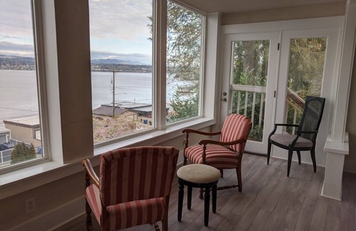 You will feel welcomed at this turn of the century home with style and views of the water from all three floors. Be a chef in the kitchen or just leisurely read a book while enjoying 180-degree views of lake Washington and Cascades! It has a spacious living room with floor to ceiling picture windows. The master with a king bed is on the main floor and there are five other cozy bedrooms, perfect for larger group stays. The third level top floor bedrooms are charming. An open deck with a porch awaits you to enjoy the changing views from sunrise to sunset. Family entertaining awaits.