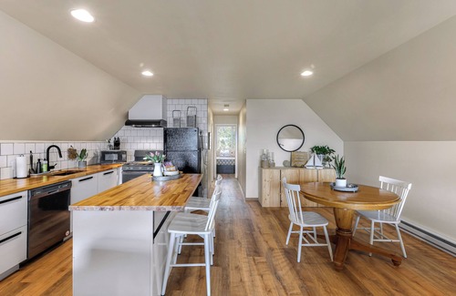 The kitchen is fully equipped with everything you need to make any meal. We also provide an assortment of coffee, tea, creamer with compliments of sugar and honey sticks. The island and dining table both seat 2, with a nearby cupboard for storing food and items as needed.