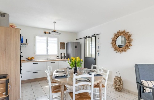 Delight in the comforts of House "La Perle de Damgan," a recently renovated vacation rental in Damgan, France. This inviting abode offers a private fenced property spanning 245 square meters with a lush lawn, ideal for outdoor relaxation. The accommodation provides ample parking on the premises and a designated storage room for bicycles. Enjoy the convenience of having a supermarket within a 500-meter radius and seamless internet access with WiFi.