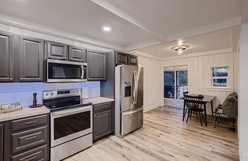 Experience comfort and style in our private two bed one bathroom retreat. The 750sqft cabin was completely remodeled into a light and airy space giving it a spacious and modern feel. Relax on our mountain observation deck, soak brand new hot-tub, and star gaze around the gas fire pit. Prepare meals together with our fully stocked kitchen, for your convenience. Continue enjoying the mountain air and cook on outdoor grill set up with propane. Comfortably sleep four, with two queen beds. Each with their own room and unique decor.
