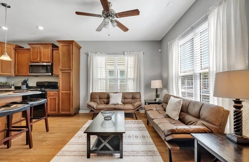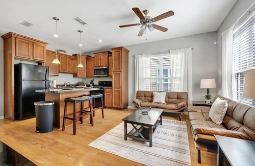 This two-story townhome offers plenty of space with one comfy Queen bedroom with en-suit bath located on the main floor. Upstairs, you will find a Queen bedroom and a bedroom with 2 comfortable Full size beds . All bedrooms enjoy full bathrooms with tub/shower combo's, and are equipped with HD smart Tv's. Guests are provided access to the community pool and gym as well. The kitchen is fully stocked for full meal preparation and dining.